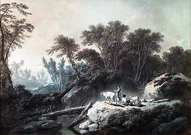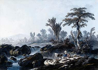 Jean Pillement 1728 Lyon 1808 Lyon Landschaft mit Wasserfall und rastenden Schäfern, 1782 Pastell 59 x 81 cm bez. u.l.: Pillement 1782 Inv.-Nr. 1679 |