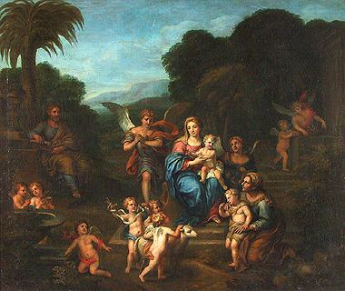 Werkstatt des Michel Corneille d. J. 1642 Paris 1708 Paris Die Ruhe auf der Flucht nach Ägypten (Die hl. Familie mit dem Jesusknaben, Engeln und der hl. Elisabeth) Öl auf Leinwand 99 x 117 cm unbez. beschr. auf der Kreuzfahne: (EC)CE AGNUS DE(I) Inv.-Nr. 1678 |